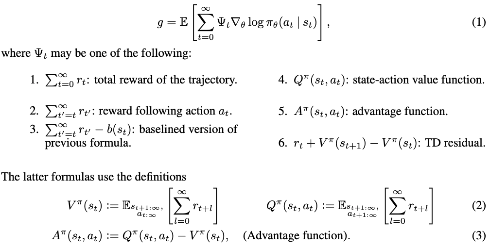It turns out that there are several related expressions for the policy gradient (see Schulman et al’s paper for more details). The estimator I derived above used the reward, but there are many other valid expressions all of which have the following form: